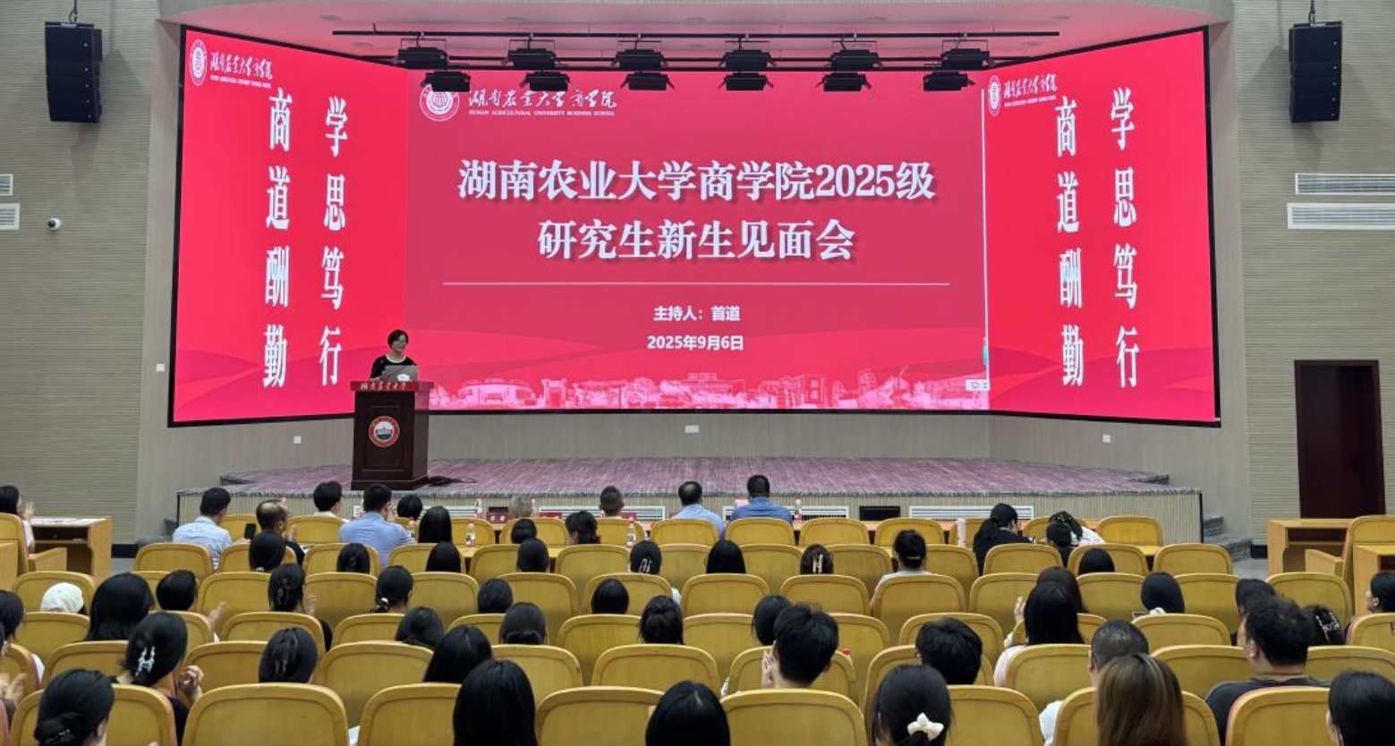 本网讯(商学院 周子怡)2025年9月6日晚,湖南农业大学商学院在图书馆大成厅隆重举行2025级研究生新生见面会。会议由商学院党委副书记首道主持,院领导、学位点领衔人、新生班主任、全体新生...
